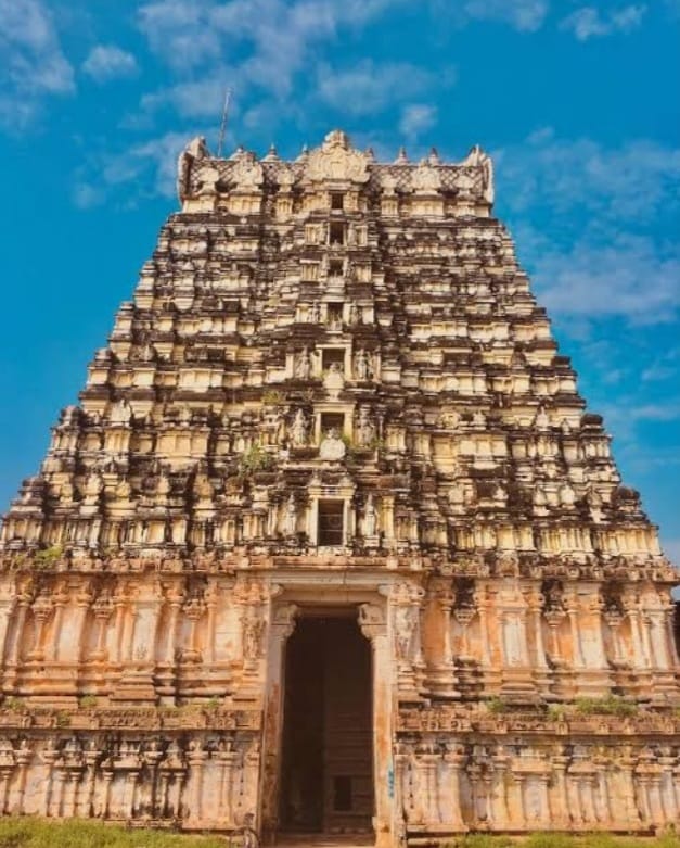 கோவிலின் முன் ராஜ கோபுரம் ஏழு அடுக்குகளை கொண்டு கம்பீரமாக நிற்கிறது.ஏழு அடுக்குகளுக்கும் செல்வதற்கு படிக்கட்டுகள் அமைந்துள்ளது மேலும் ஒரு சிறப்பு.